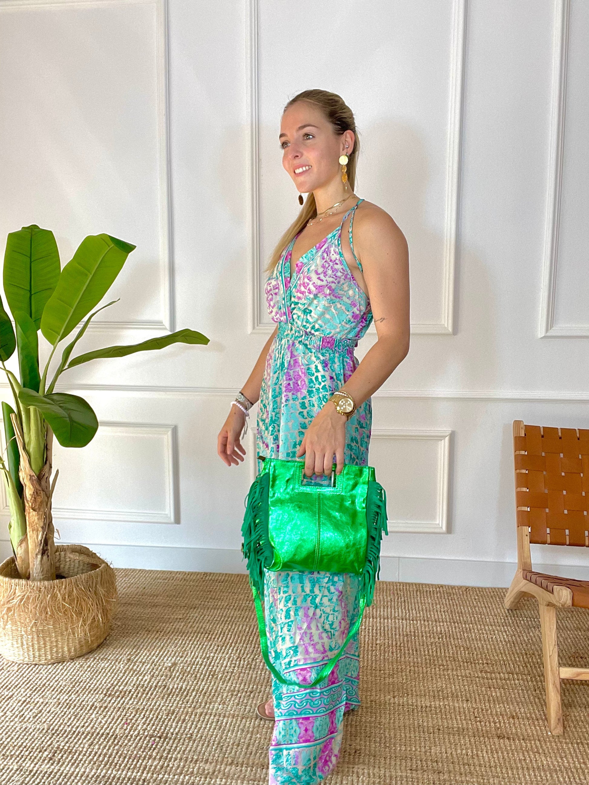 Inspirado en la moda de lujo, el Bolso Bacquet es una joya con una piel metalizada y flecos que aseguran un toque único a cada estilo. Disfruta de este bolso exclusivo que refleja la elegancia, el buen gusto y la tendencia inigualables.