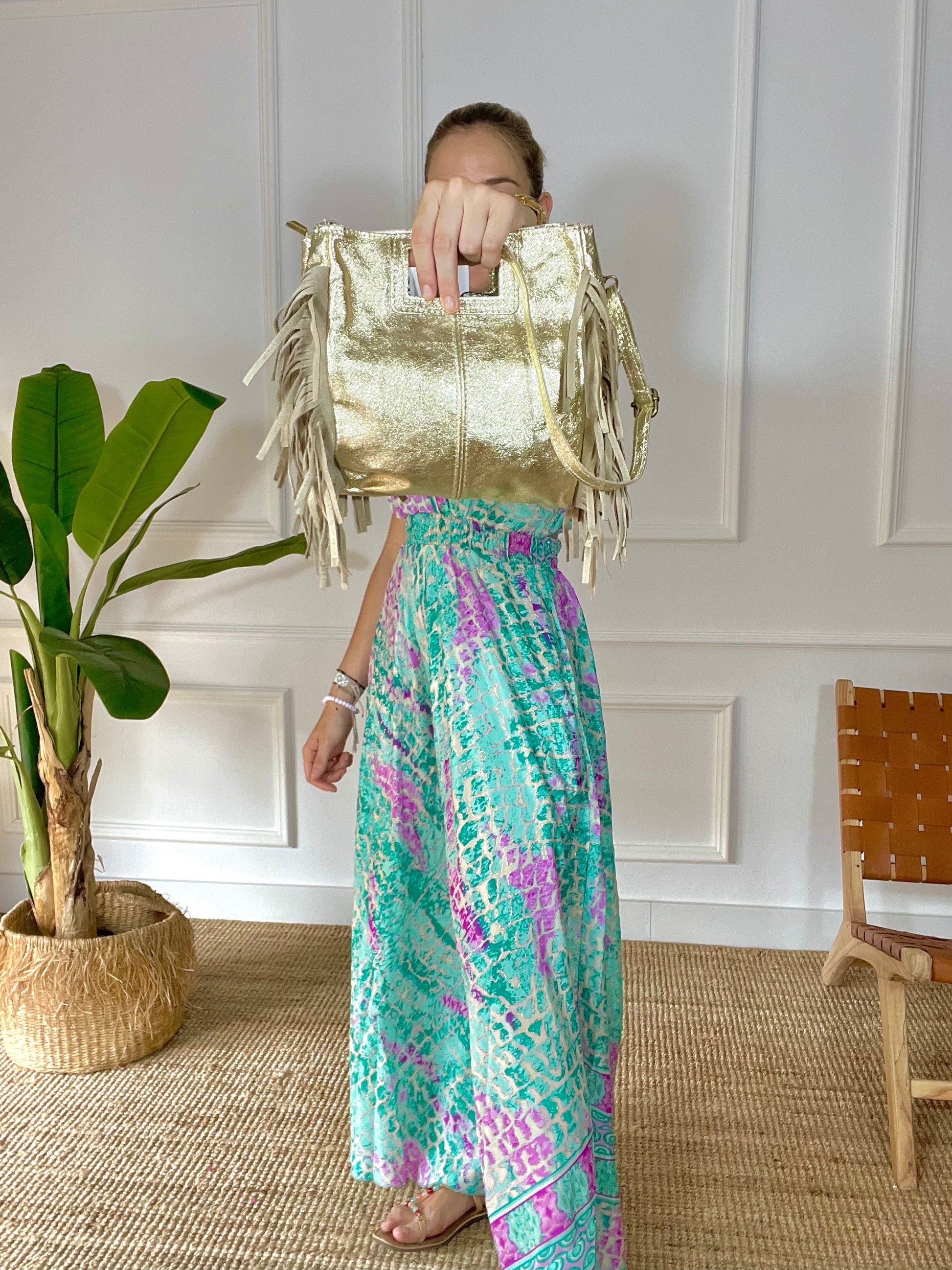 Inspirado en la moda de lujo, el Bolso Bacquet es una joya con una piel metalizada y flecos que aseguran un toque único a cada estilo. Disfruta de este bolso exclusivo que refleja la elegancia, el buen gusto y la tendencia inigualables.