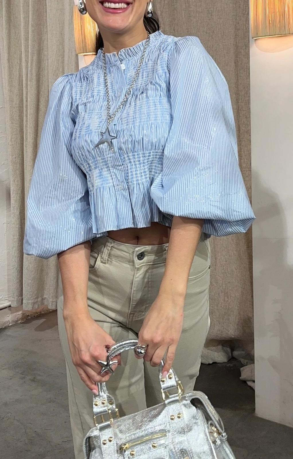 ¡Siéntete divertida y a la moda con nuestra camisa Loira! Con su diseño de rayas con lurex y detalle de frunce, te hará destacar en cualquier ocasión. Además, su tela suave y ligera te mantendrá cómoda todo el día. ¡Hazte con una ahora!