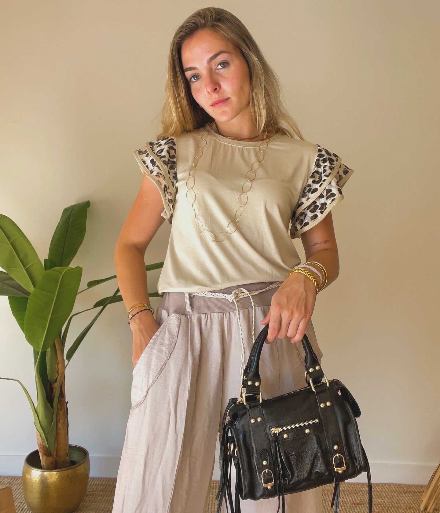 Descubre un nuevo nivel de estilo con nuestra camiseta Géraldine. Hecha con una manga animal print, esta pieza exclusiva es perfecta para añadir un toque de sofisticación a cualquier look. Con un diseño elegante, esta camiseta te hará destacar entre la multitud y te convertirá en la envidia de todos.
