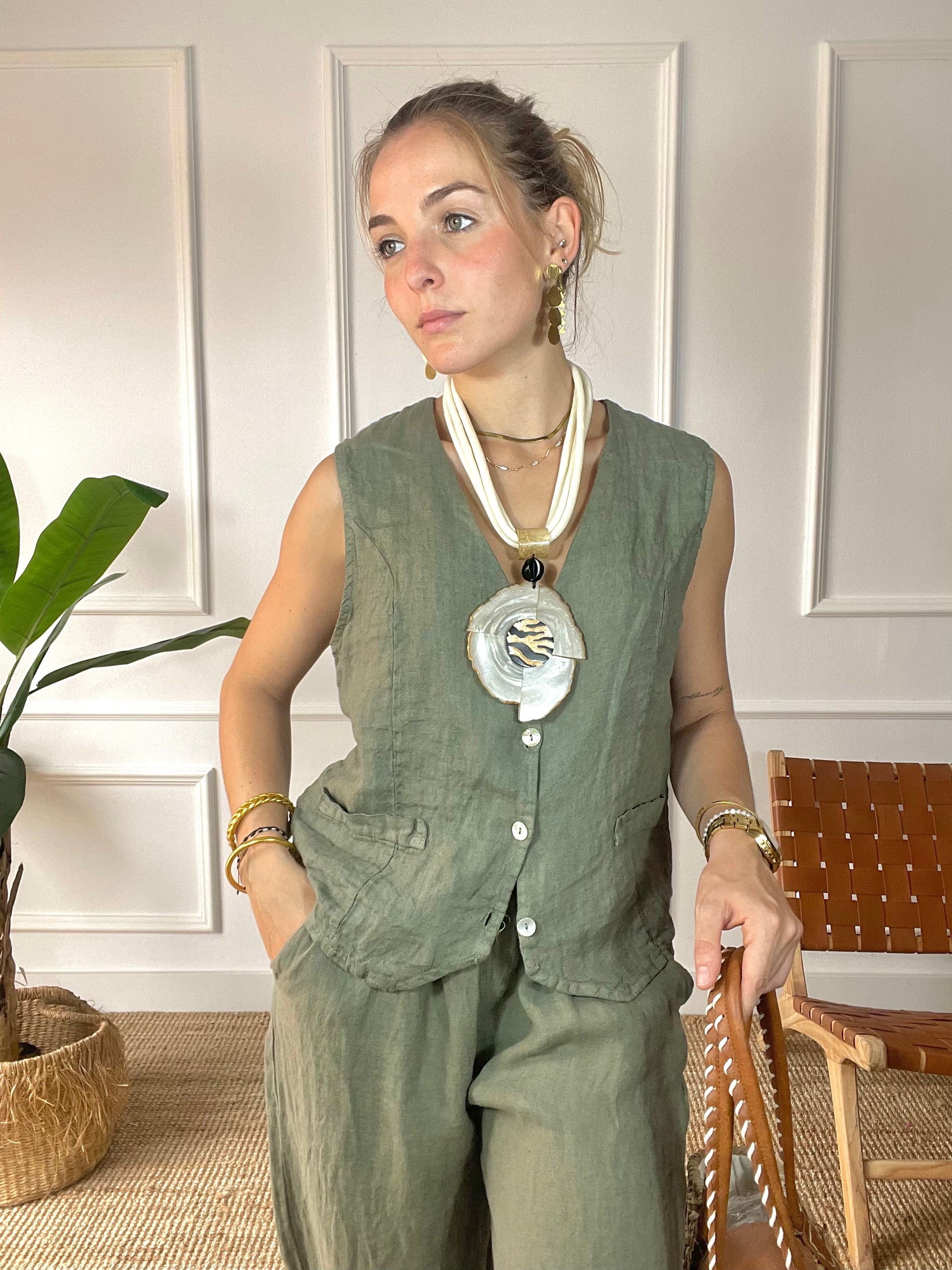 Elegante y exclusivo, el chaleco Alastra es la prenda de lujo para llevar con estilo. El lino de primera calidad y los discretos botones de nácar le confieren una apariencia suave y refinada que destaca entre la multitud. Lleva el lujo a tu guardarropa.