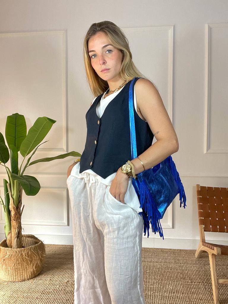 ¡Lúcete en cualquier ocasión con el Chaleco Wendys! Este chaleco de lino sutilmente texturado es la prenda perfecta para los días festivos. Simplemente refinado con sus detalles cosidos a mano, el Chaleco Wendys es el complemento sofisticado que le dará el toque final a cualquier atuendo.