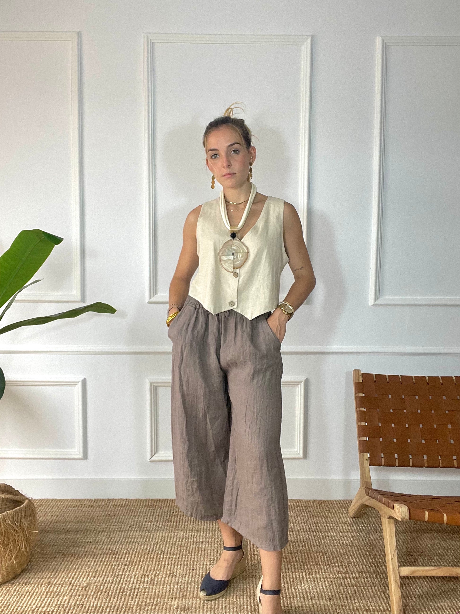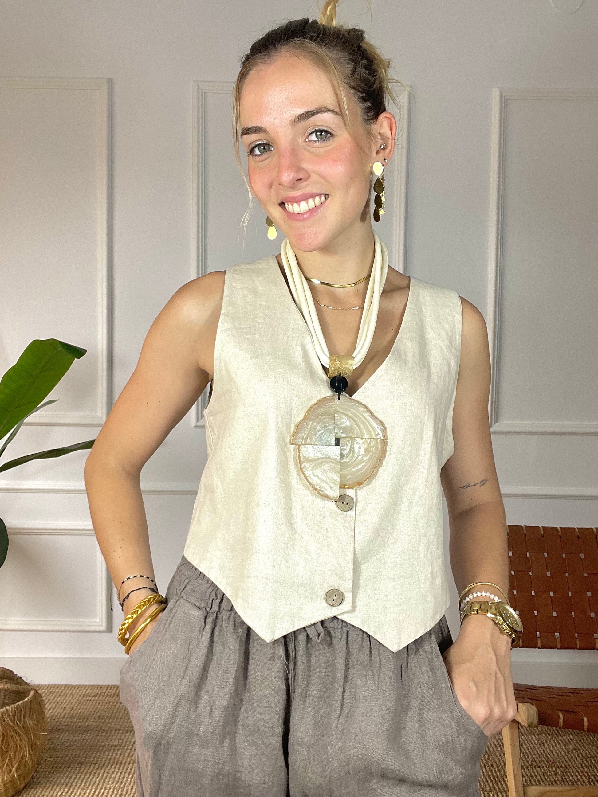 ¡Lúcete en cualquier ocasión con el Chaleco Wendys! Este chaleco de lino sutilmente texturado es la prenda perfecta para los días festivos. Simplemente refinado con sus detalles cosidos a mano, el Chaleco Wendys es el complemento sofisticado que le dará el toque final a cualquier atuendo.