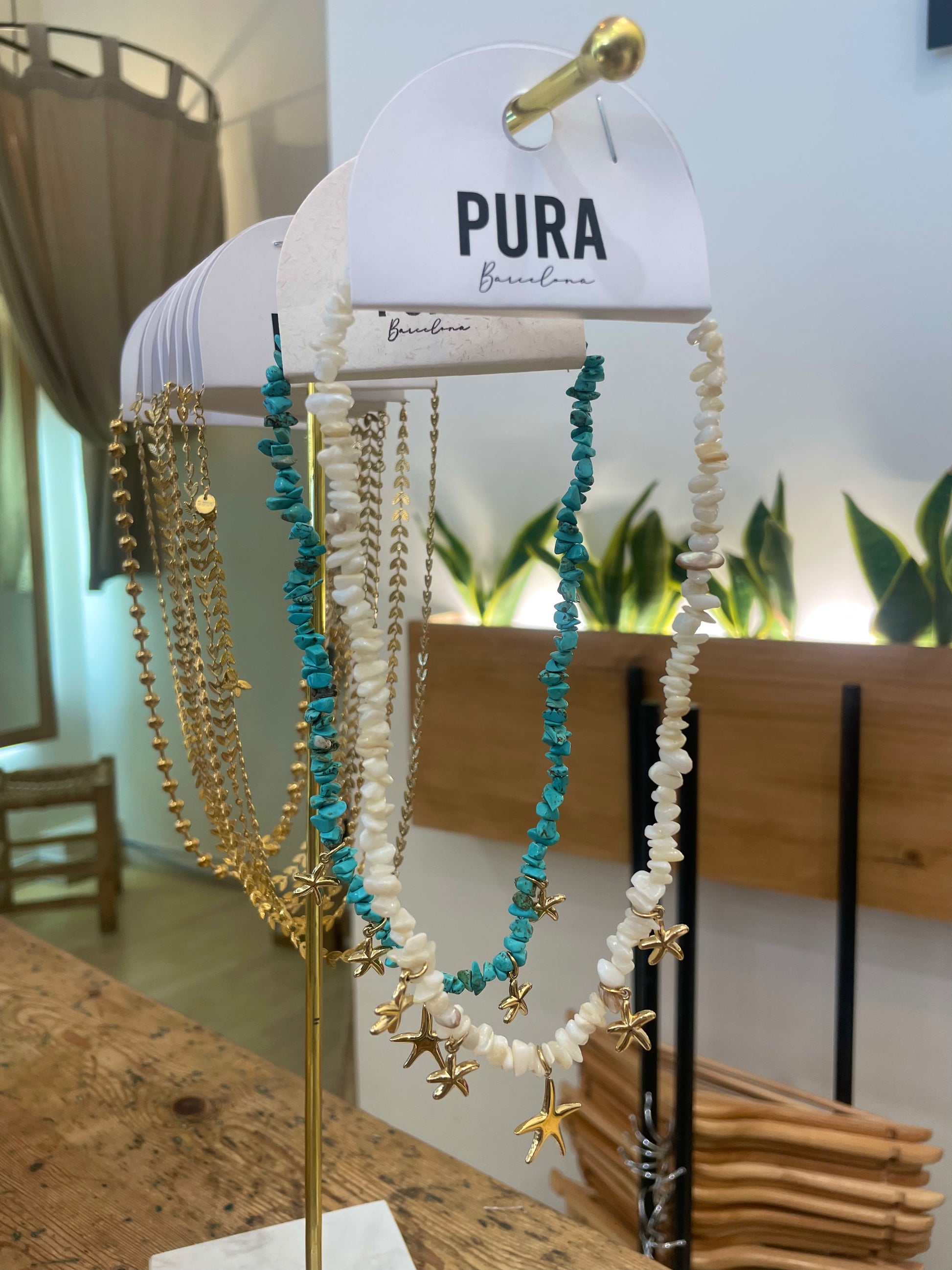 Déjate llevar por la elegancia y la exclusividad del Collar Eltra. Con su diseño de piedras y colgantes de estrellas, lucirás como una verdadera estrella. Un accesorio que te hará brillar en cualquier ocasión y te hará sentir como una verdadera obra de arte.