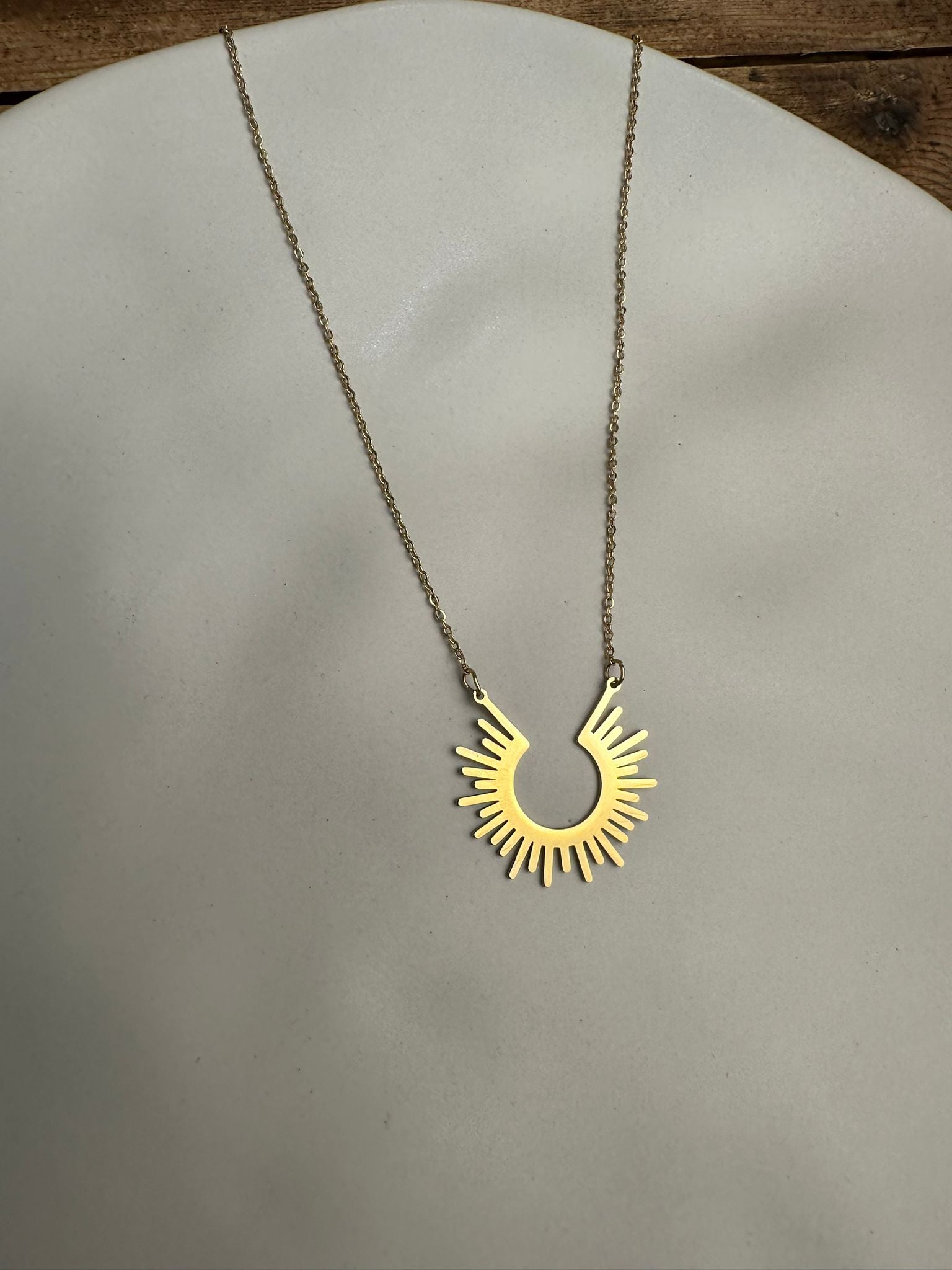 Con Collar Half Sun, siente el sol brillar en tu cuello con estilo. Este collar dorado presenta una figura abstracta de medio sol, perfecto para la mujer con un sentido de moda un poco fuera de lo común. ¡Agrega un poco de brillo y humor a tu look con este collar único en su tipo!