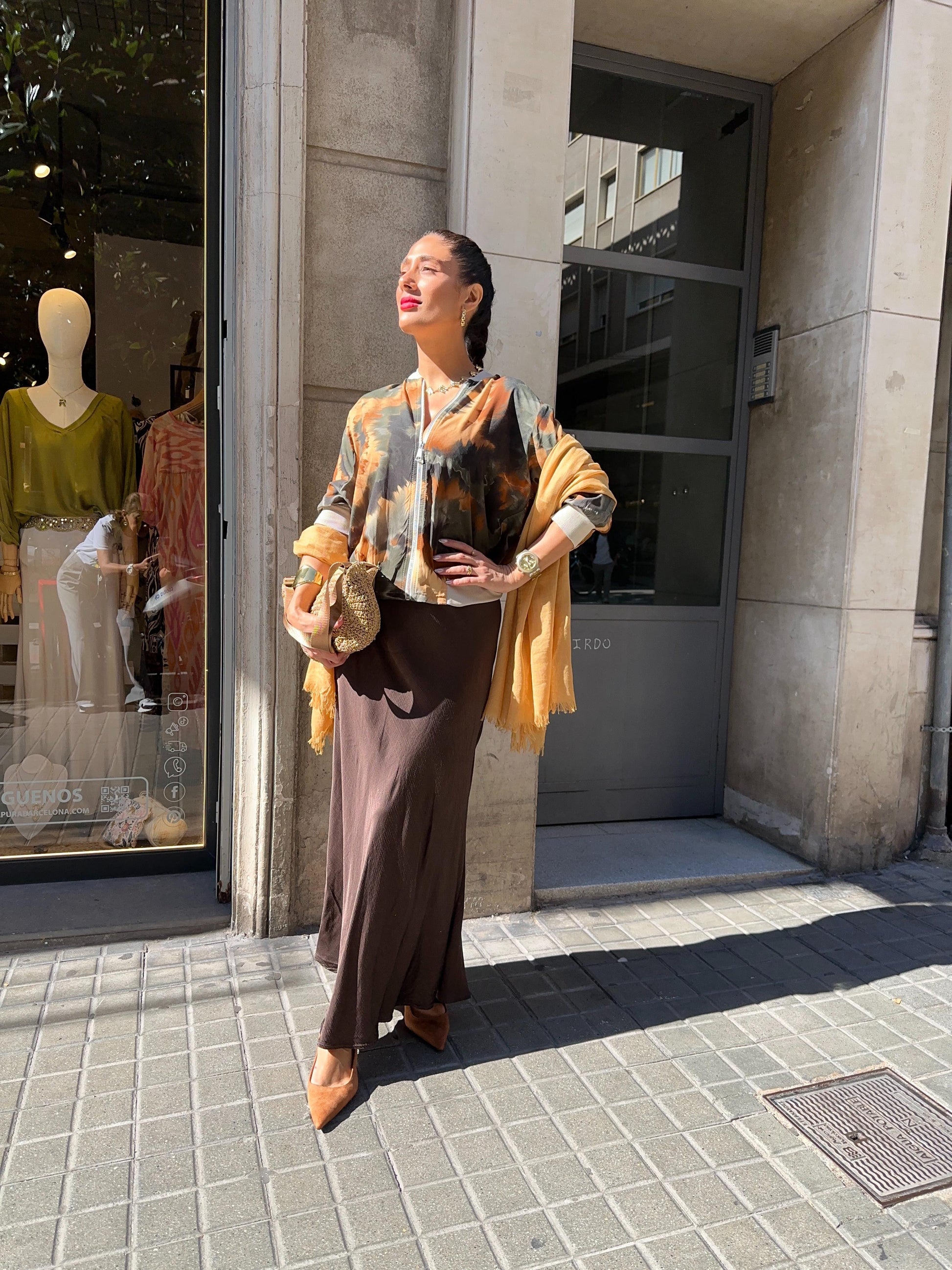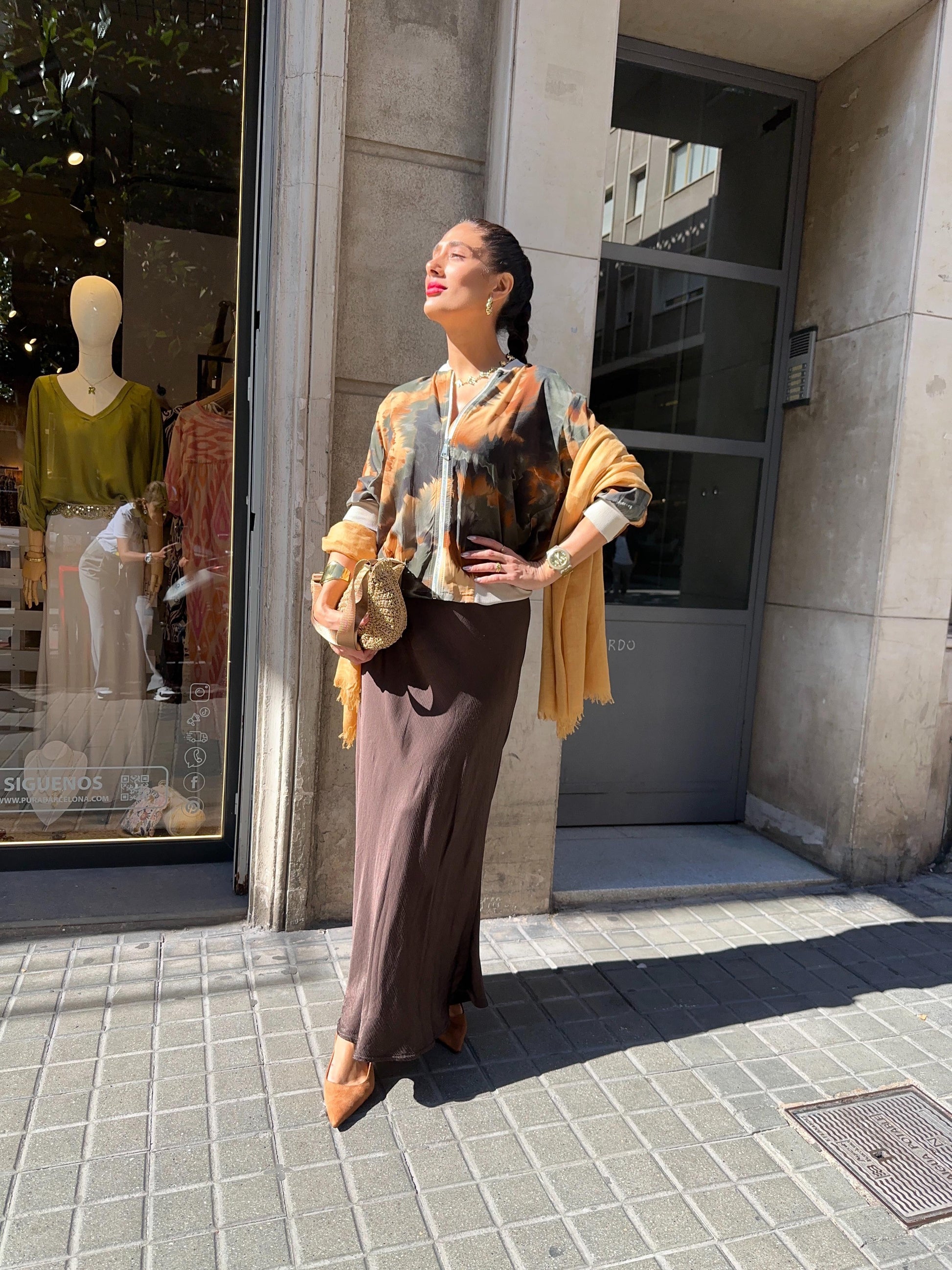 Falda Midi lisa, de satén tramado