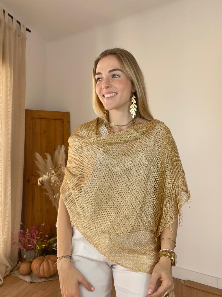 Un regalo perfecto para los amantes de la moda, el Fular Mindi dorado está hecho con un tejido suave con flecos dorados, para destacar tu look. Es el accesorio perfecto para añadir un toque glamoroso a tu ropa.