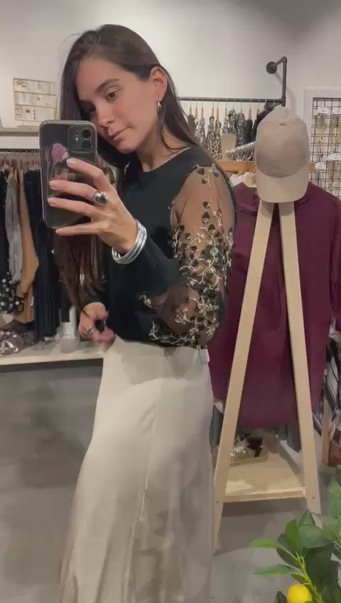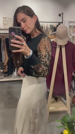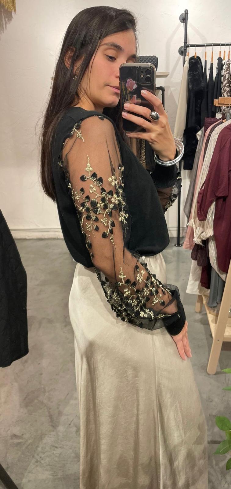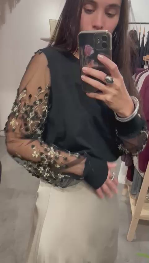 Nuestro Jersey Catherine es una pieza única que combina la suavidad del jersey de punto con la elegancia del tul bordado en flores. Perfecta para una apariencia sofisticada y exclusiva. Hazte notar en cualquier ocasión con este diseño que combina arte y moda.