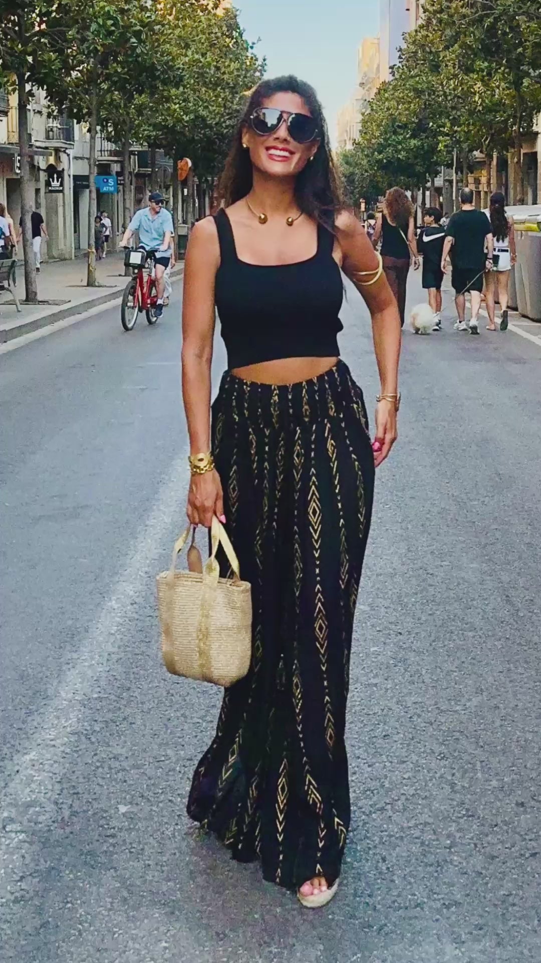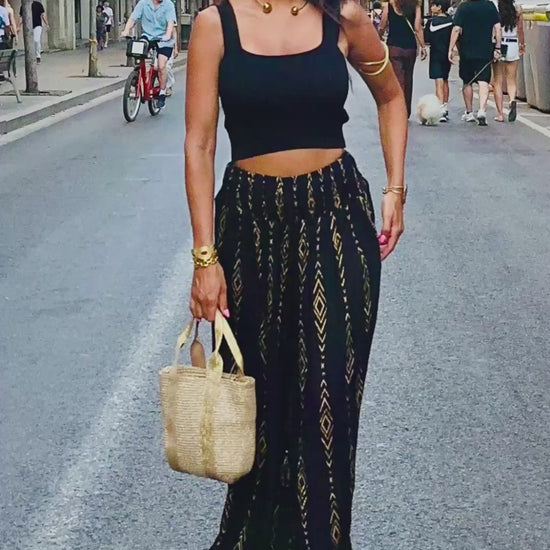 Maxi pantalón cintura panal, elastizada, lurex