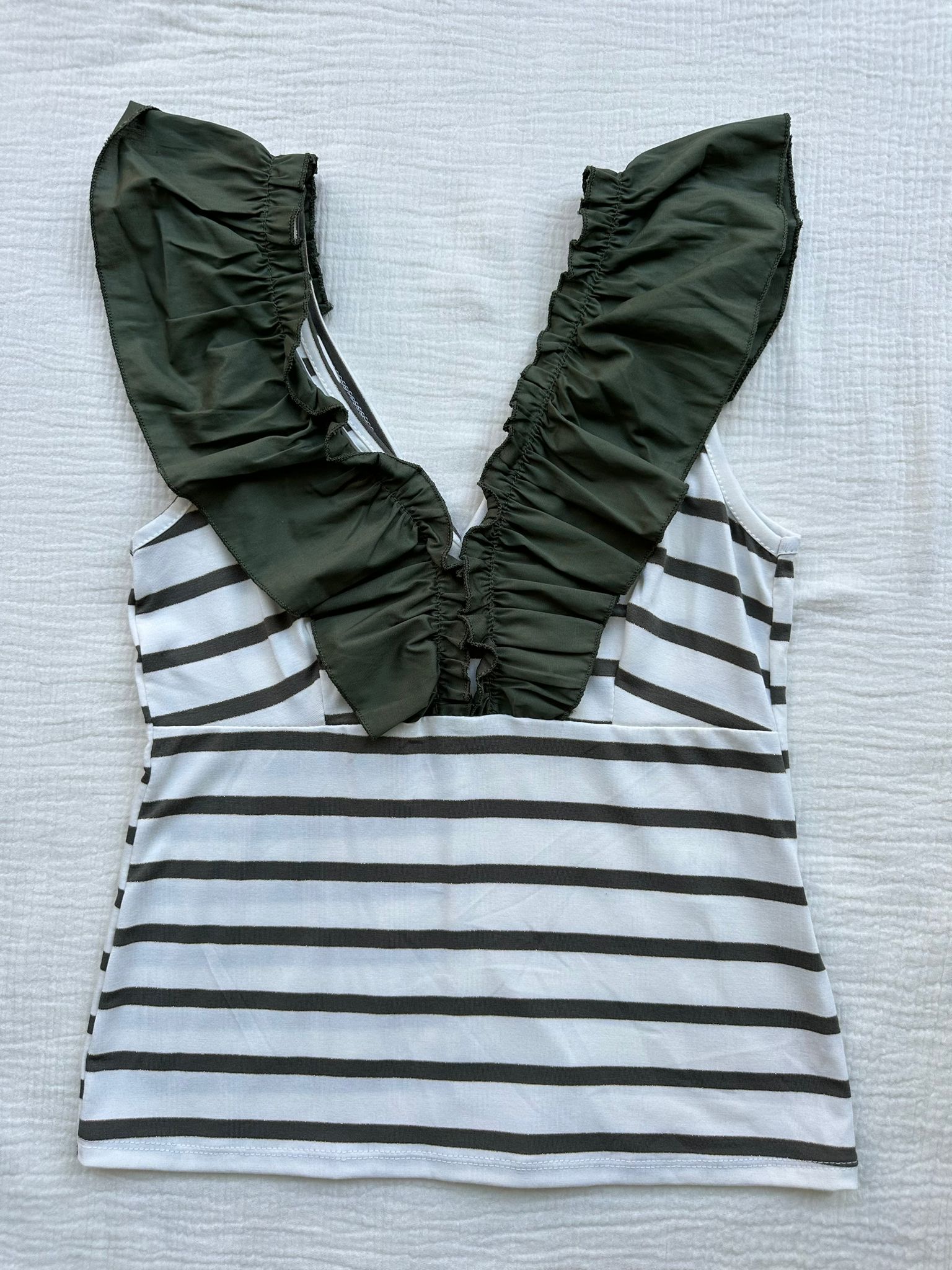 ¡Lleva tus outfits al siguiente nivel con nuestro Top Cecilia! Este top rayado cuenta con un elegante volante en el hombro, agregando un toque arriesgado y de movimiento a tu look. Ideal para las amantes de la moda que buscan un estilo desafiante y único. ¡Atrévete a ser diferente con el Top Cecilia!
