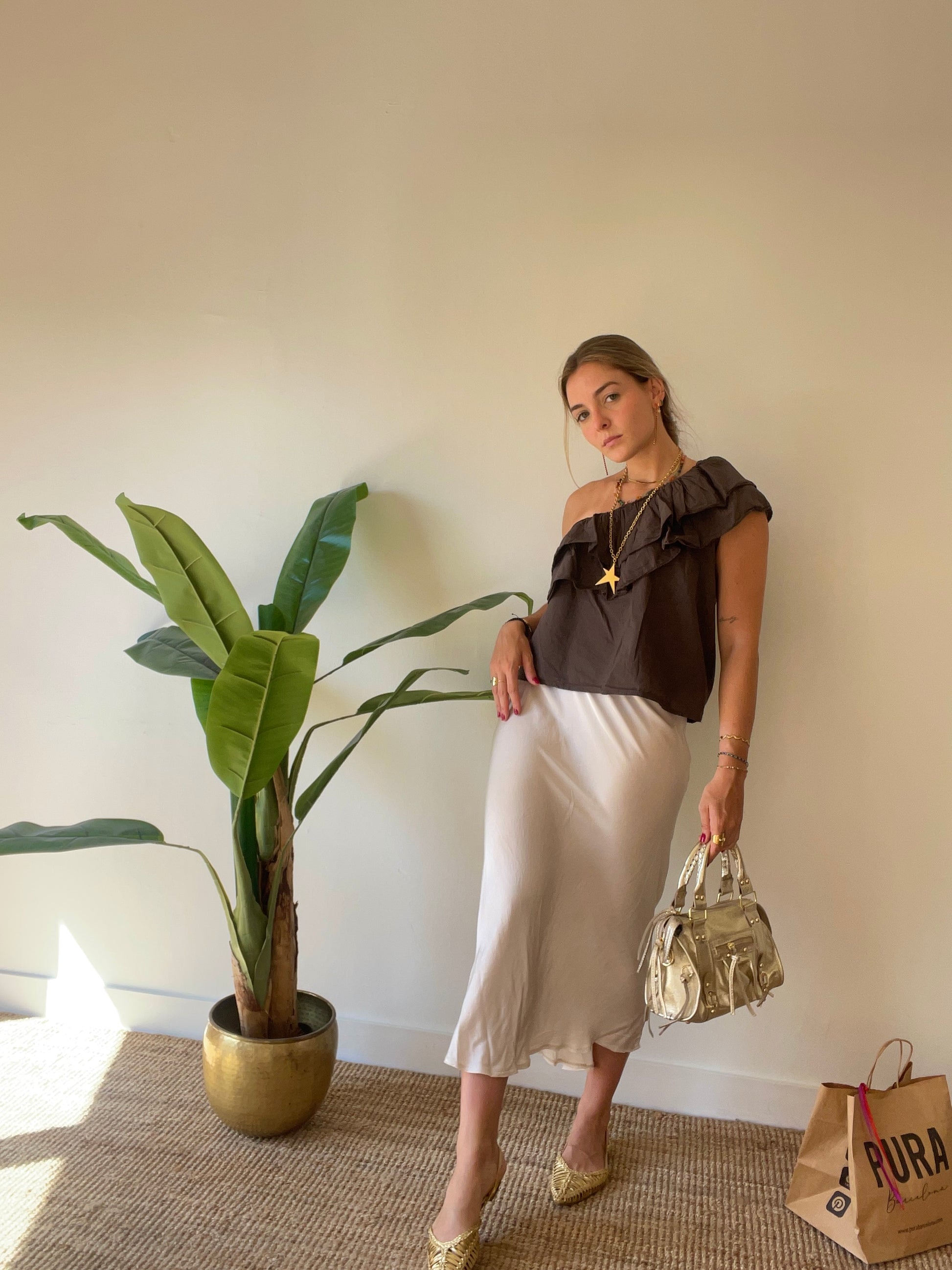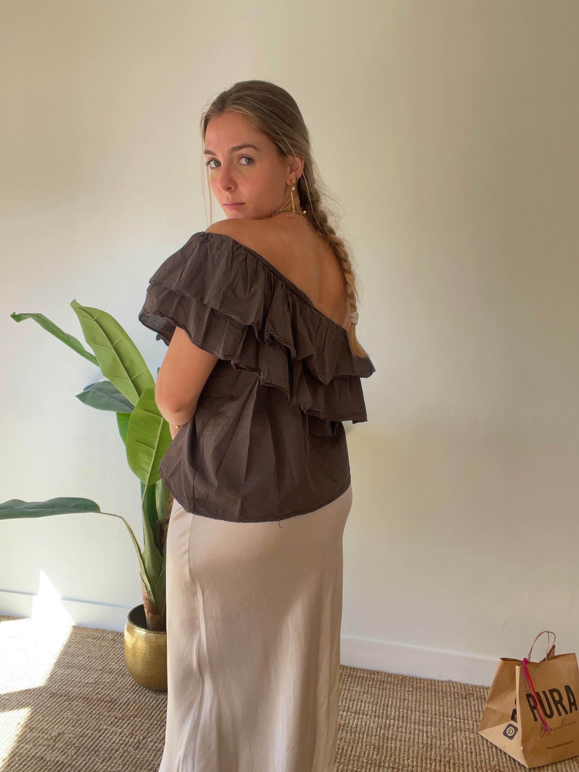 El Top Dana es una opción elegante y exclusiva para tu guardarropa. Con su hermoso diseño de doble volante y manga única, aporta un toque de sofisticación a cualquier conjunto. Luce como una obra de arte con esta hermosa pieza de alta costura.