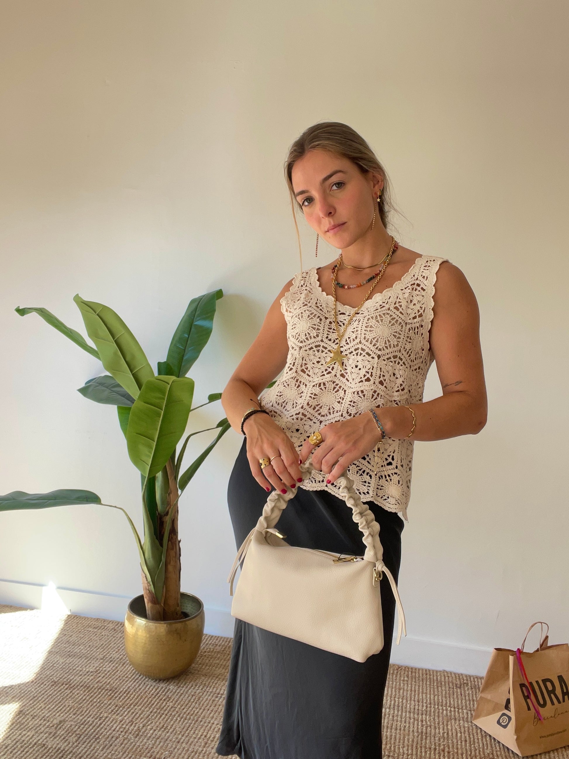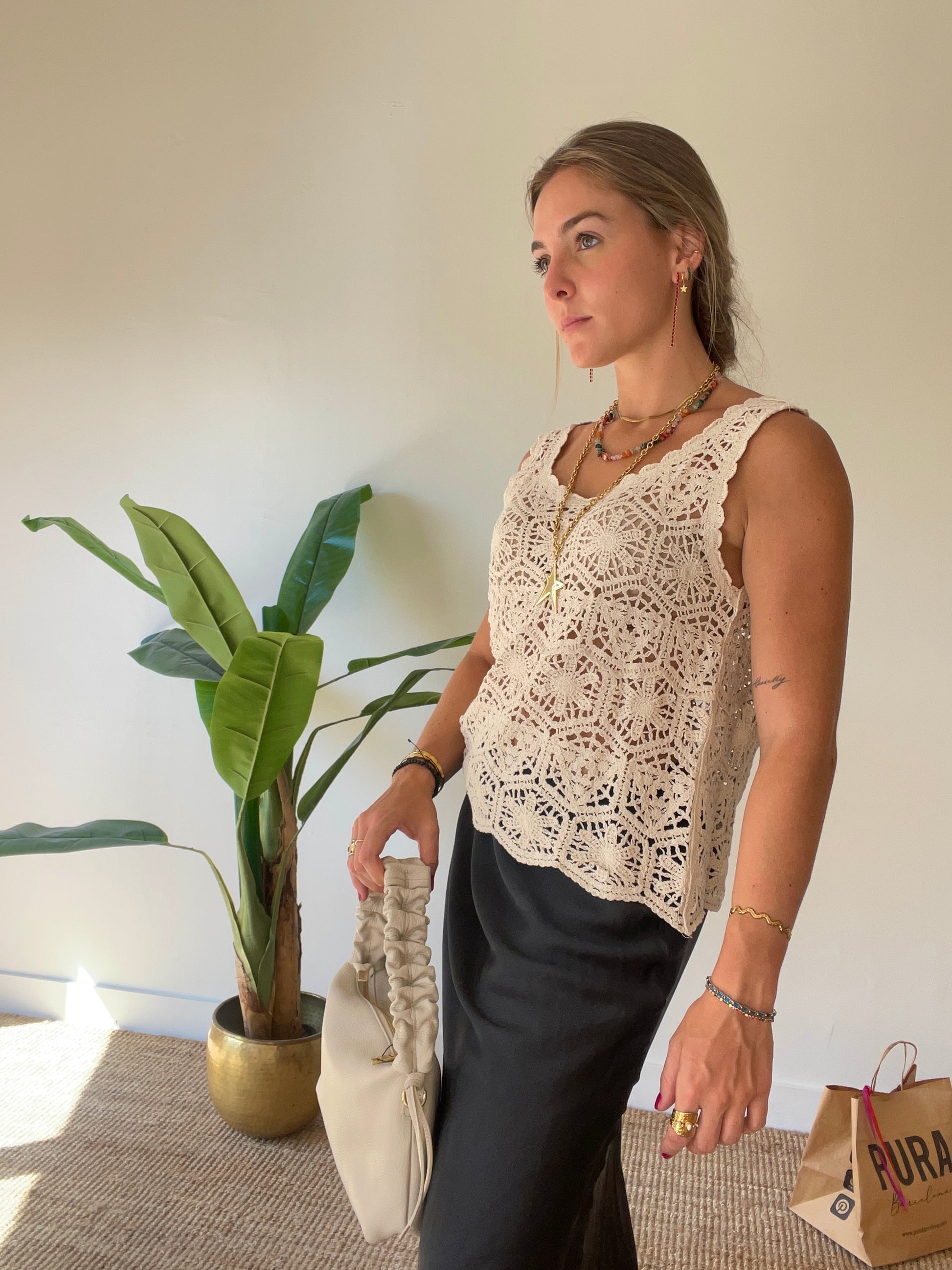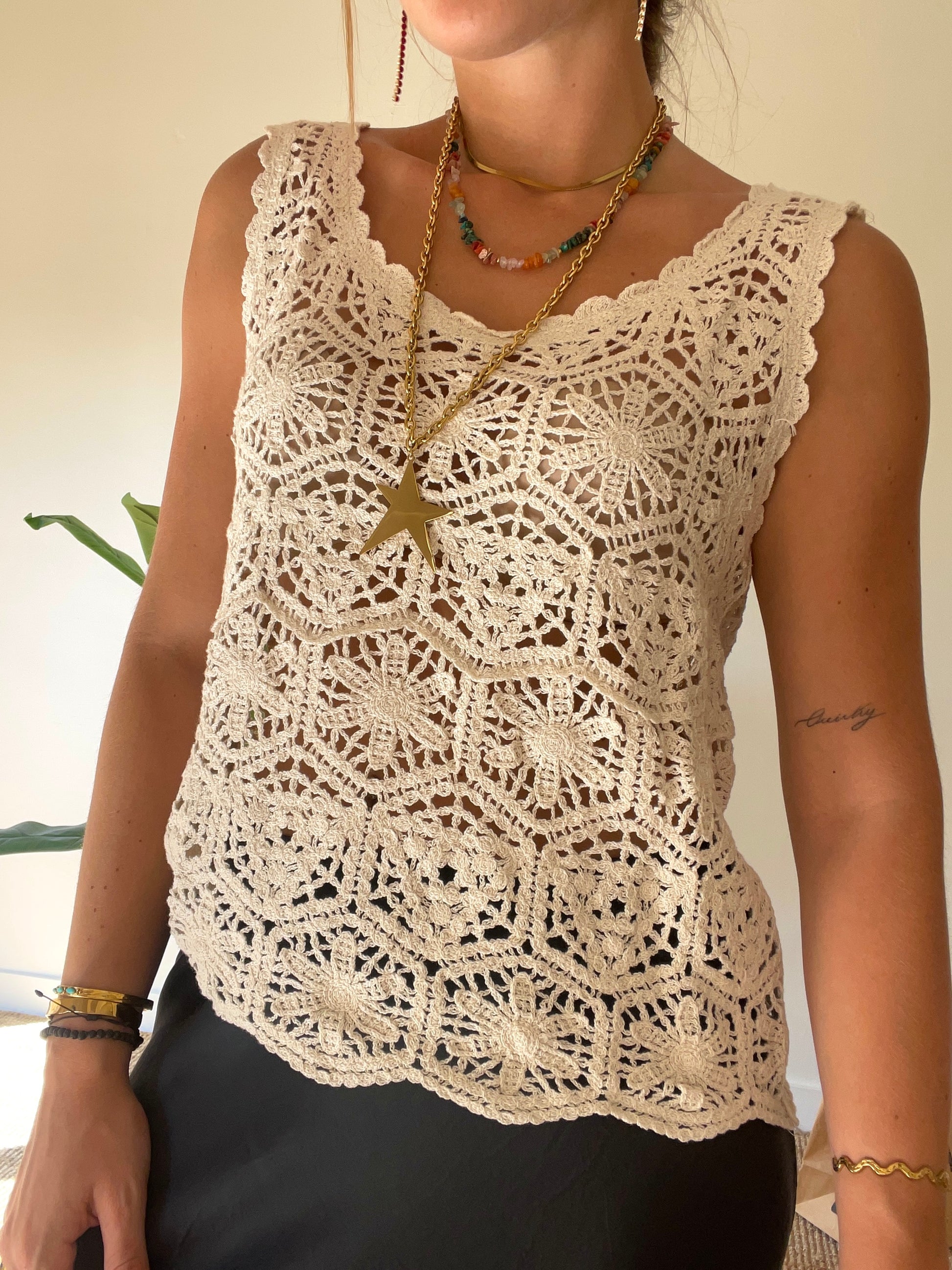 Déjate llevar por la sofisticación del Top Emmaline. Con su delicado diseño de crochet, esta prenda te hará sentir elegante y exclusiva. Su textura única y suave se adapta a tu cuerpo a la perfección, haciendo de este top la elección perfecta para cualquier ocasión. Conserva el estilo y la clase con el Top Emmaline.