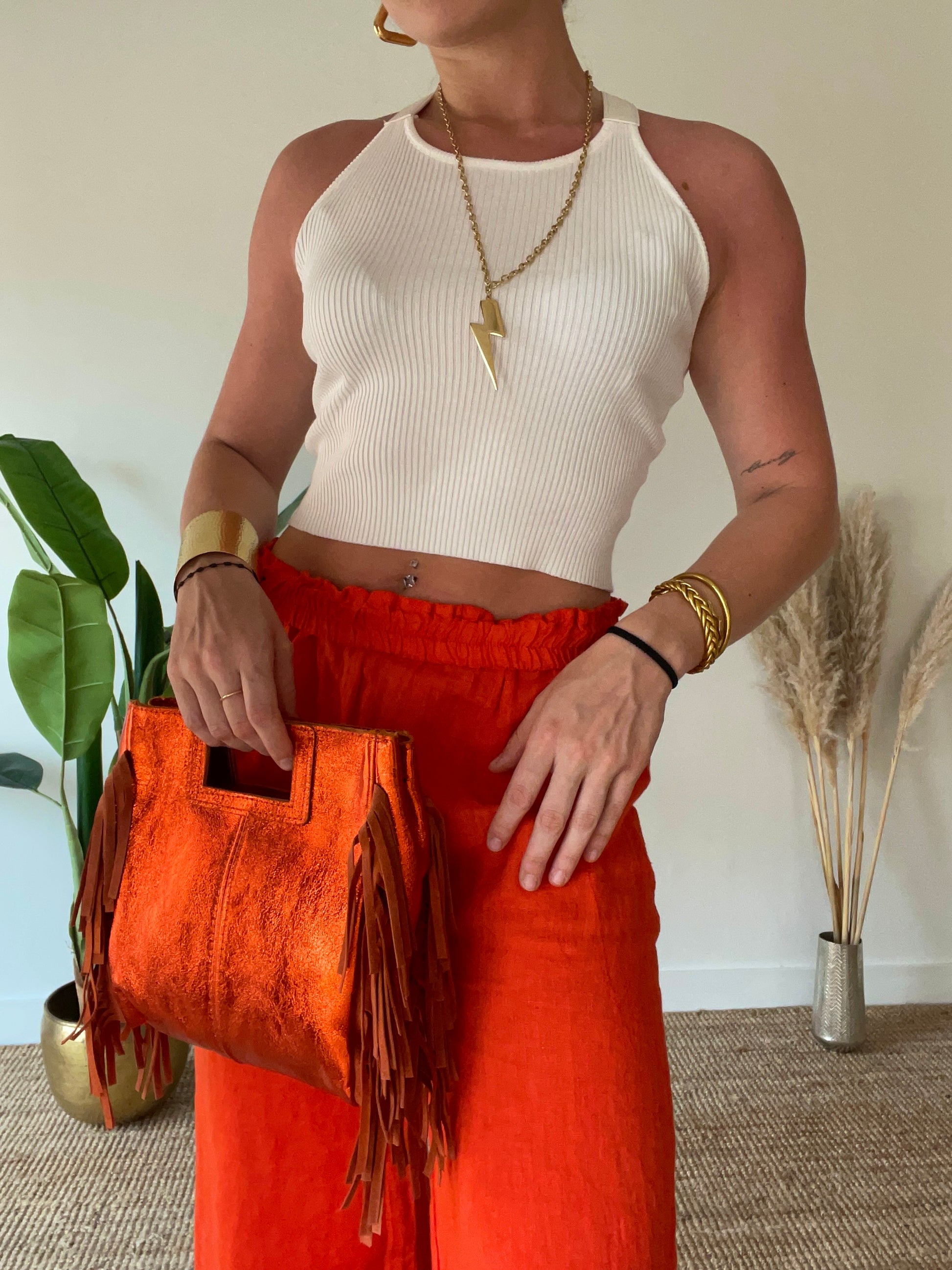 ¡Eleva tu estilo con el Top Nereia! Con su detalle de cinturón, este top de canalé te dará un look único y arriesgado. ¡Demuestra tu audacia y haz una declaración con este top que te hará destacar en cualquier ocasión!