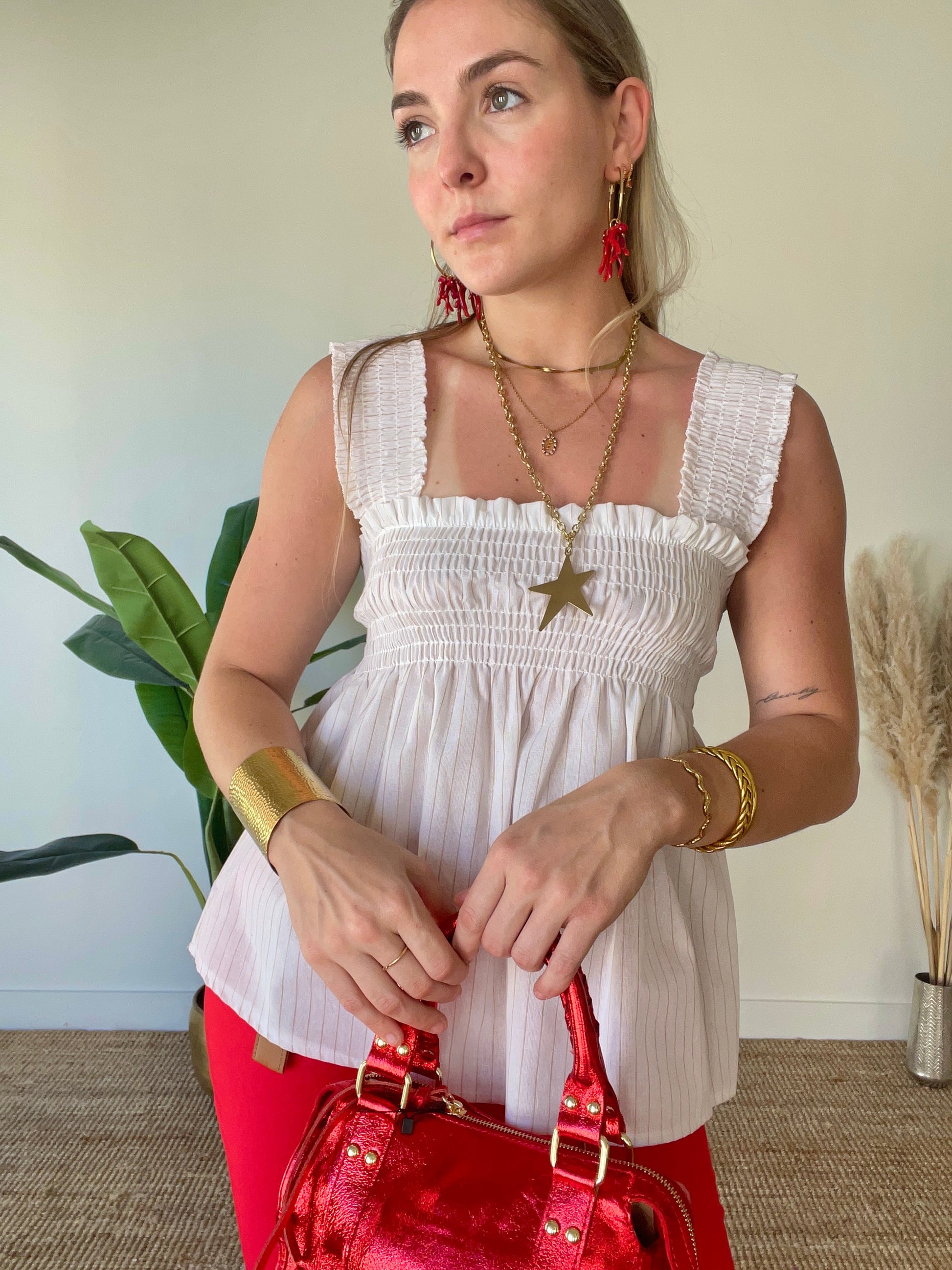 Descubra la elegancia y exclusividad del Top Porter. Con un diseño rayado y bretel ancho, este top es perfecto para cualquier ocasión. Hecho con una suave goma para un ajuste perfecto y cómodo. Experimente la armonía del lujo en cada detalle de este top.
