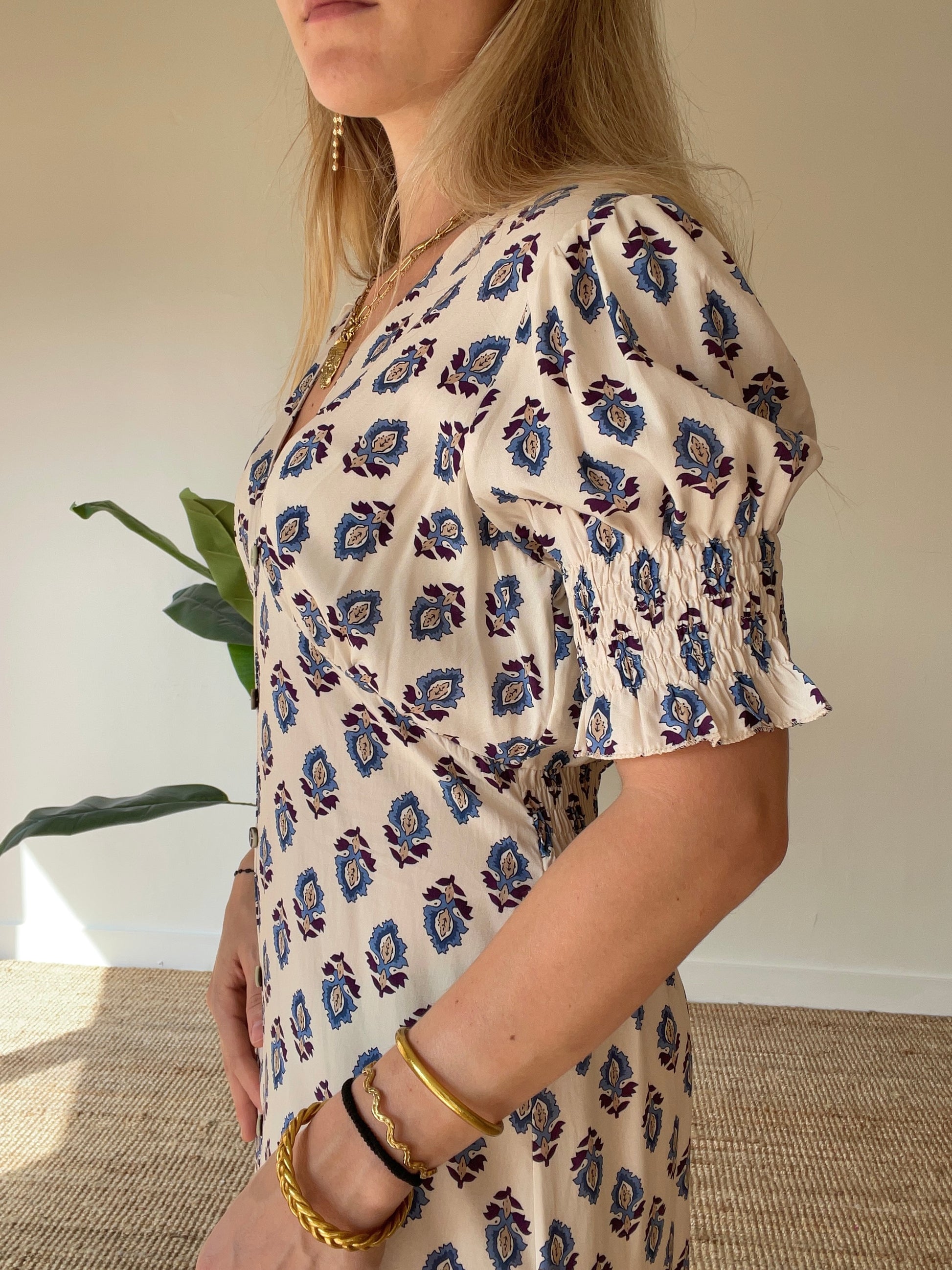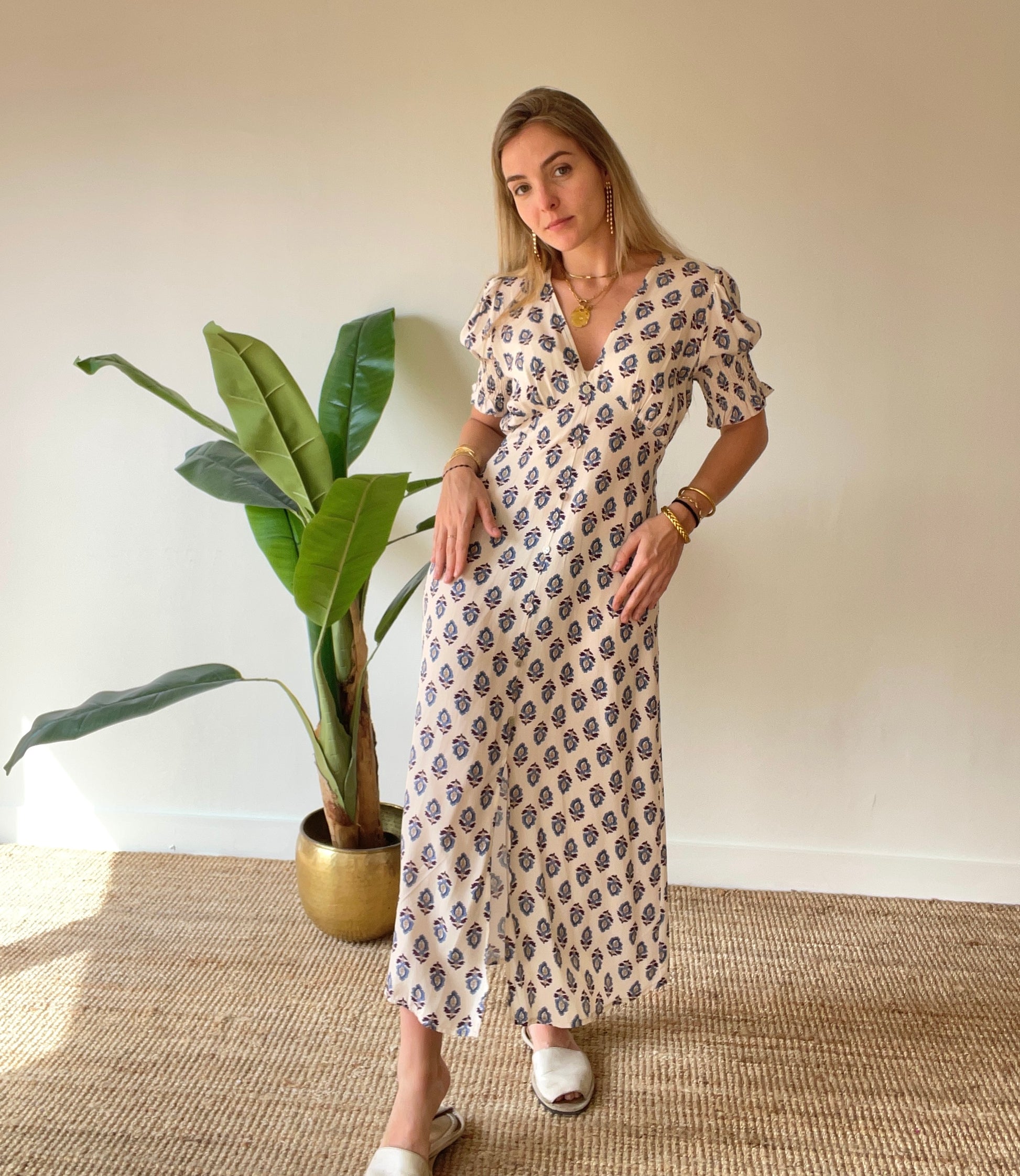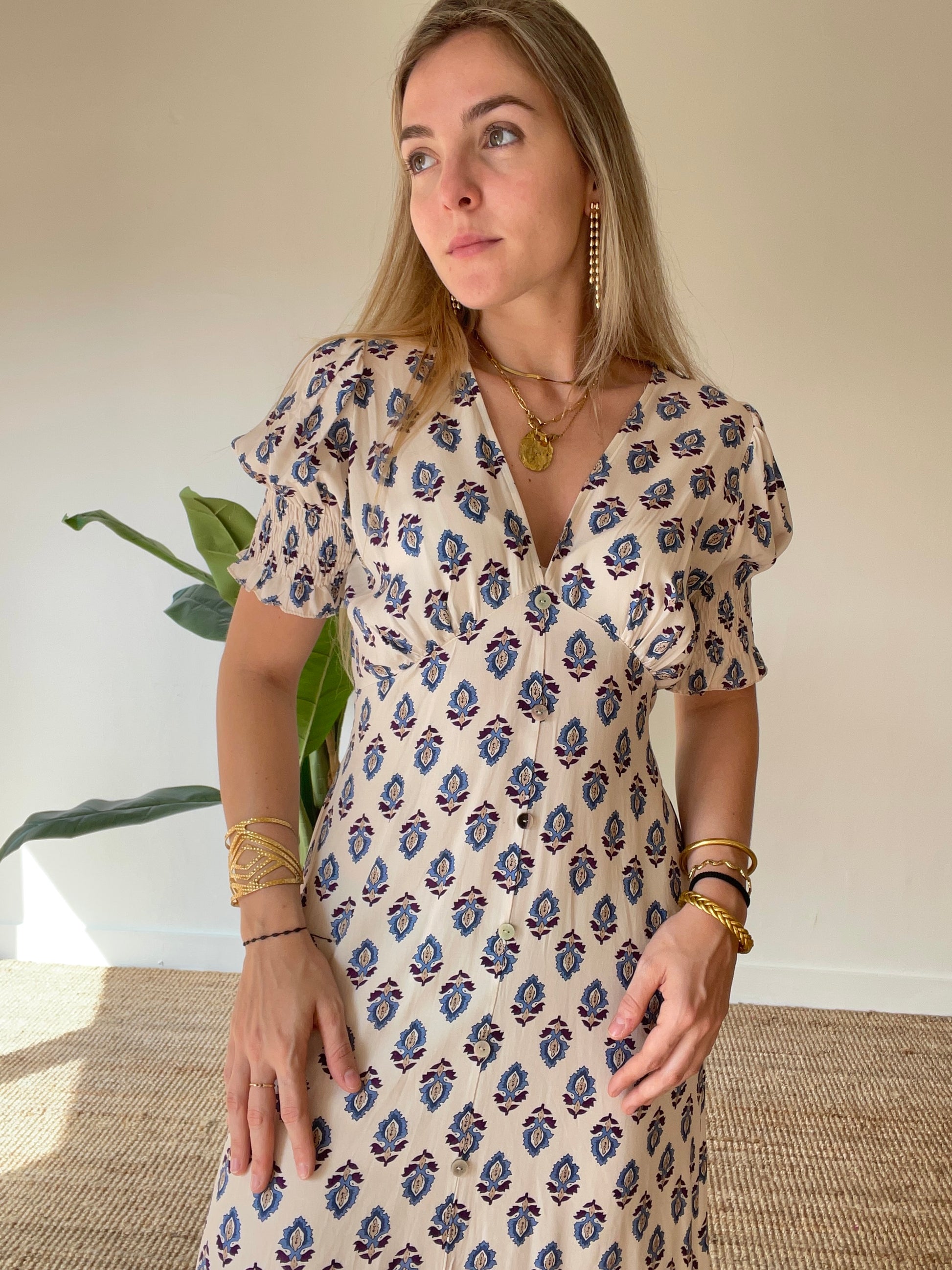 Descubre el glamour y la elegancia del Vestido Upland. Confeccionado en fibrana estampada y adornado con botoncitos de nácar, este vestido te hará sentir como una obra de arte en movimiento. Su diseño exclusivo y sofisticado te llevará a nuevos niveles de sofisticación en cualquier ocasión.