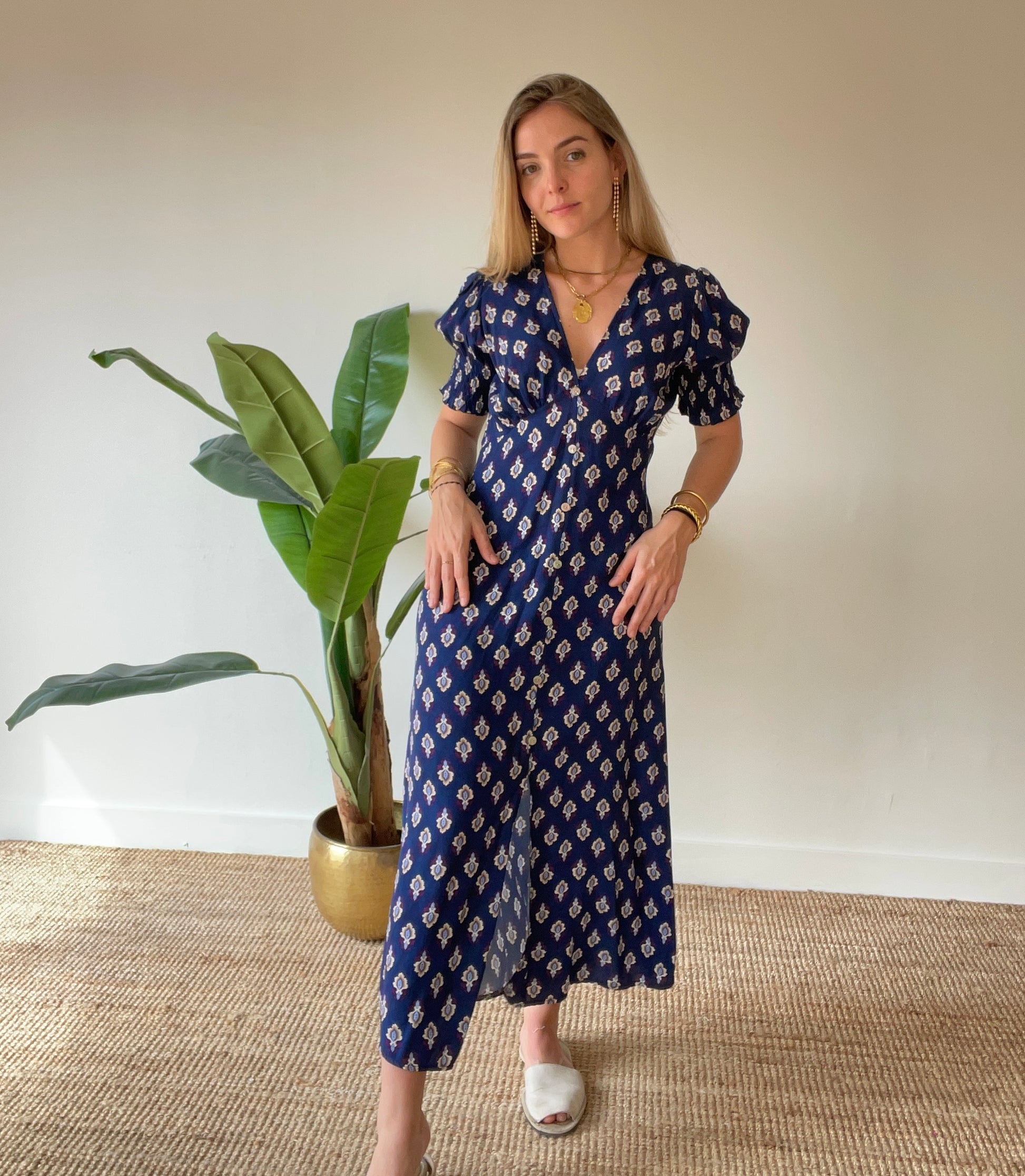 Descubre el glamour y la elegancia del Vestido Upland. Confeccionado en fibrana estampada y adornado con botoncitos de nácar, este vestido te hará sentir como una obra de arte en movimiento. Su diseño exclusivo y sofisticado te llevará a nuevos niveles de sofisticación en cualquier ocasión.